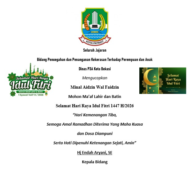 Bekasi Iklan Seluruh Jajaran Bidang Pencegahan dan Penanganan Kekerasan Terhadap Perempuan dan Anak Dinas P3A Kota Bekasi Mengucapkan Selamat Hari Raya Idul Fitri 1447 H/2026 17 Maret 2026 | 22:25 WIB18 Maret 2026 | 08:26 WIB admin