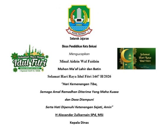 BEKASI Iklan Seluruh Jajaran Dinas Pendidikan Kota Bekasi Mengucapkan Selamat Hari Raya Idul Fitri 1447 H/2026 17 Maret 2026 | 21:01 WIB18 Maret 2026 | 08:10 WIB admin