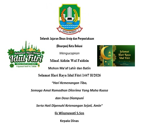 BEKASI Iklan Seluruh Jajaran Dinas Arsip dan Perpustakaan (Disarpus) Kota Bekasi Mengucapkan Selamat Hari Raya Idul Fitri 1447 H/2026 18 Maret 2026 | 08:57 WIB admin