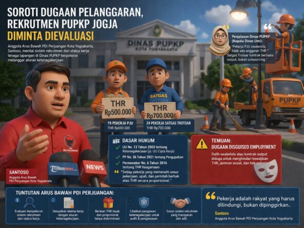 GERBANGPATRIOT.COM, Jogja – Anggota Arus Bawah PDI Perjuangan Kota Yogyakarta, Santoso, menyampaikan keprihatinan serius terkait sistem rekrutmen dan status hubungan kerja tenaga lapangan di Dinas PUPKP Kota Yogyakarta.