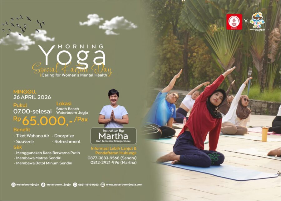 Menariknya, dengan tiket terjangkau sebesar Rp 65.000, peserta sudah bisa menikmati berbagai benefit seru. Mulai dari akses wahana air Waterboom Jogja setelah sesi yoga, refreshment, suvenir eksklusif, hingga kesempatan membawa pulang doorprize menarik.