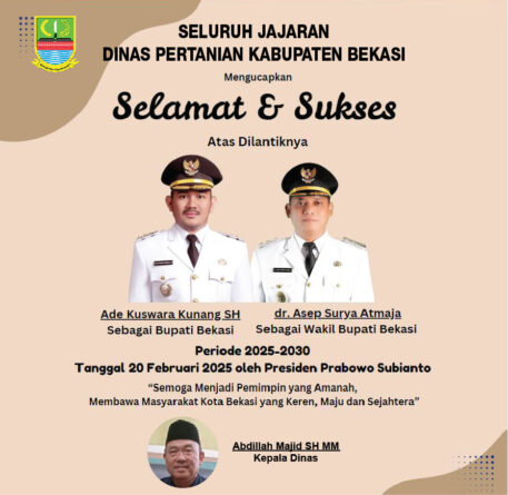Iklan Seluruh Jajaran Dinas Pertanian Kabupaten Bekasi Mengucapkan Selamat dan Sukses Atas Dilantiknya Ade Kuswara Kunang SH Sebagai Bupati Bekasi dan dr. Asep Surya Atmaja Sebagai Wakil Bupati Bekasi Periode 2025-2030 20 Februari 2025 | 19:09 WIB26 Februari 2025 | 19:10 WIB Admin Baca Selengkapnya