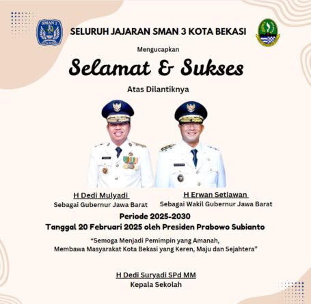 Iklan SMAN 3 Kota Bekasi Mengucapkan Selamat dan Sukses Atas Dilantiknya H Dedi Mulyadi Sebagai Gubernur Jawa Barat & H Erwan Setiawan Sebagai Wakil Gubernur Jawa Barat Periode 2025-2030 20 Februari 2025 | 23:01 WIB Admin Baca Selengkapnya